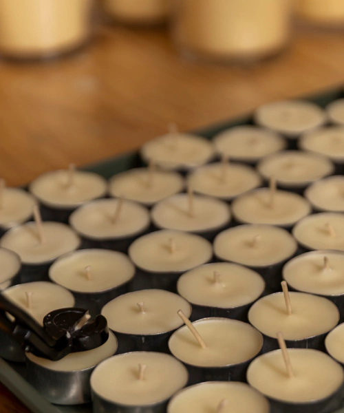 Revestido em recipiente de alumínio, 100% reciclável que protege a vela e possibilita que ela seja acesa em diversas superfícies sem sujeira.