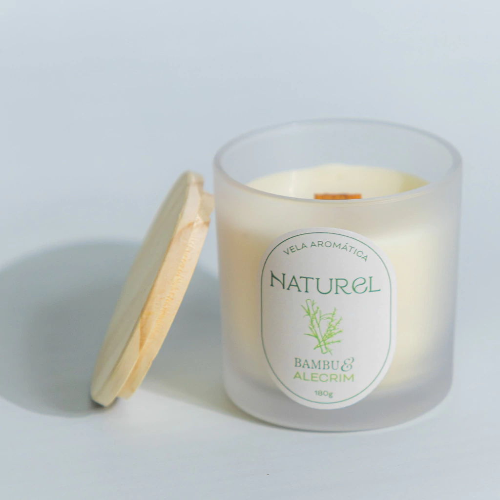 1 Vela Aromática de cera 100% vegetal em um frasco de vidro com tampa e pavio de madeira,180g.